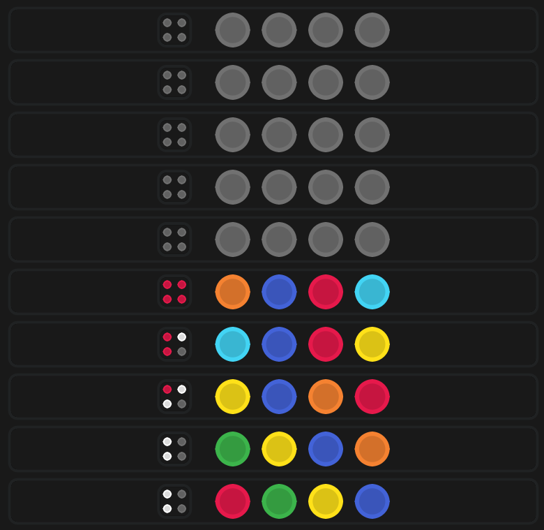 When you input your guess and submit it, smaller red and white colored key pegs are revealed on the left side. Small red key pegs mean you have a right color in the right spot and small white key pegs mean you have a right color in the wrong spot.